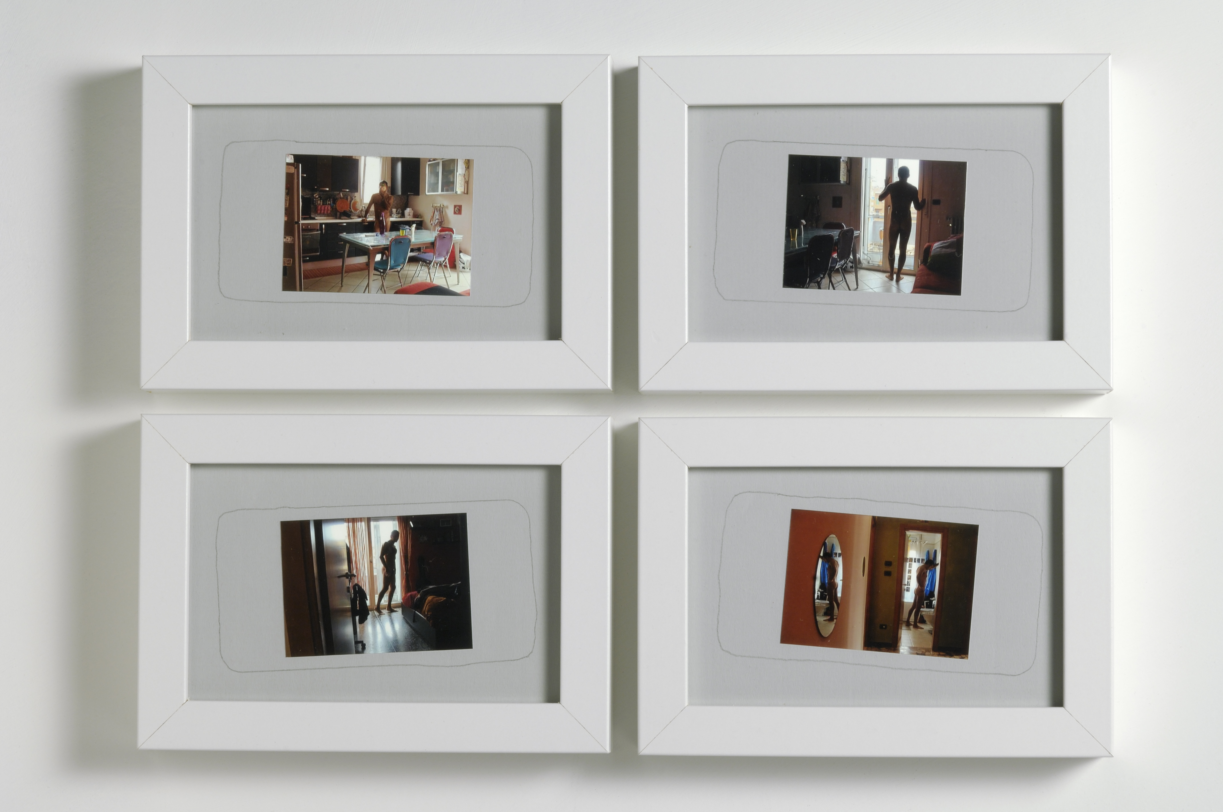 Using the camera as a tool to produce performative images, these self-portraits document actions where the artist either worked or stayed at friend’s homes. By his nudity the artist occupies and violates the spaces, evoking a sense of promiscuity along the way.